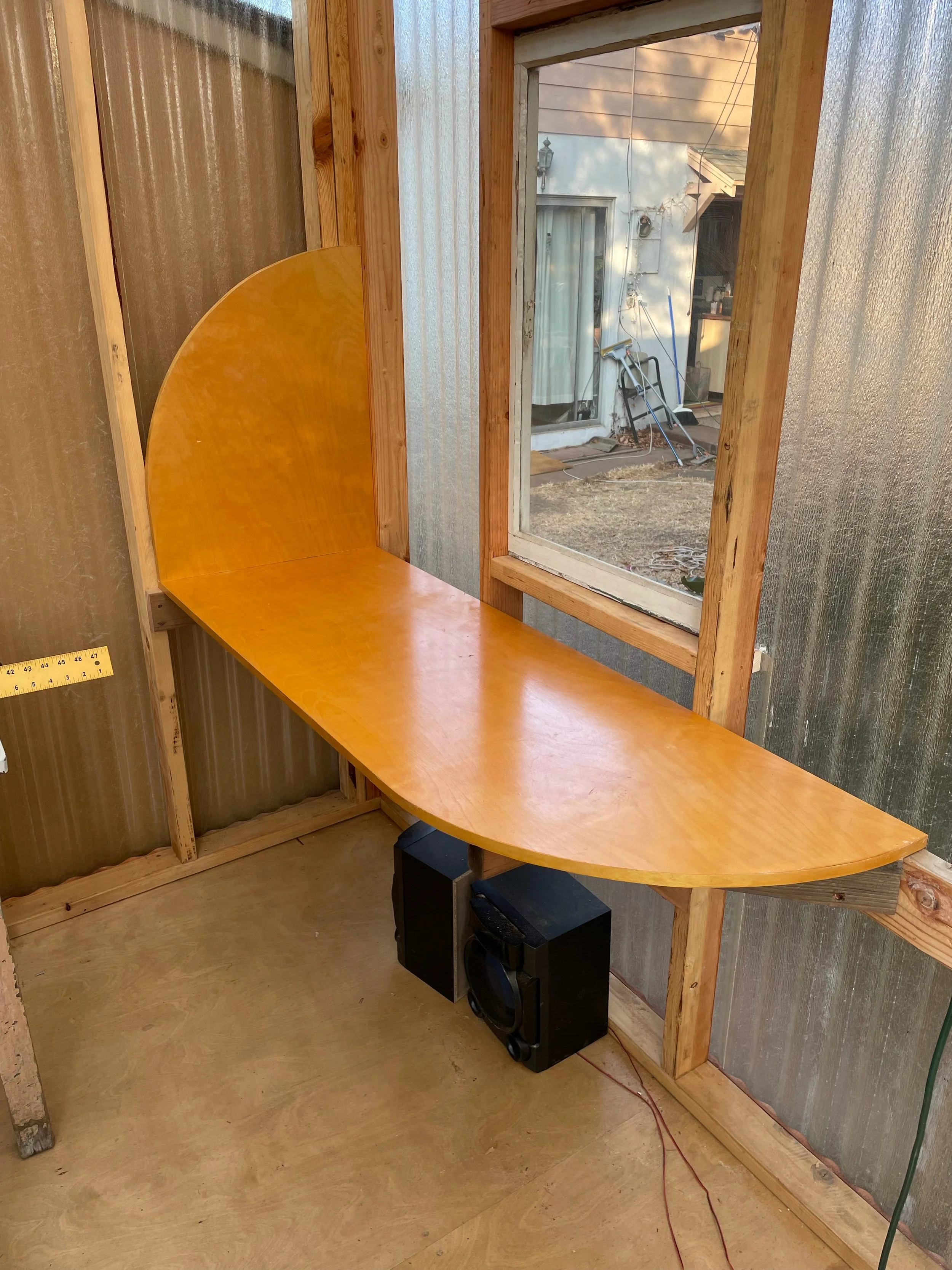 I had been planning on having the desk spaces be in the north and east walls [facing the brick wall and tuff shed] and having the west and south walls I finally decided on putting desktops on the walls with the windows. This also entails not having plywood on any walls. And having shelving and other stuff on the north and east walls.