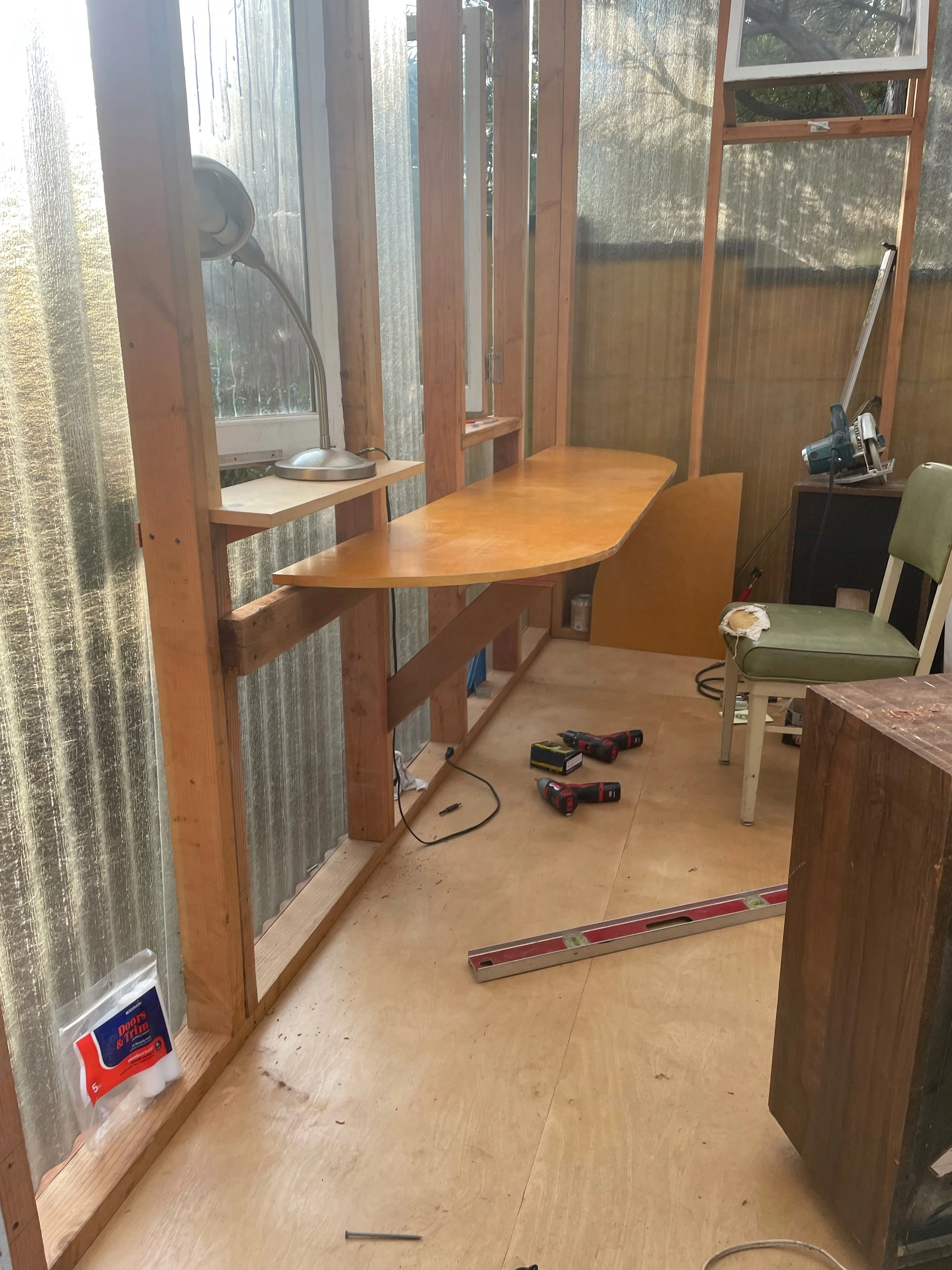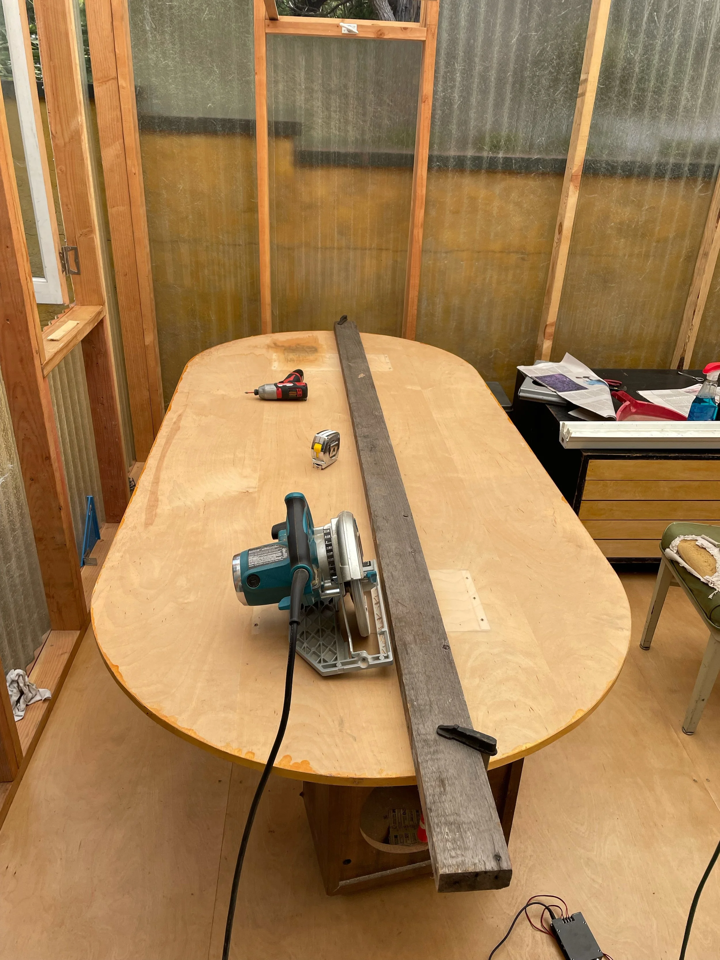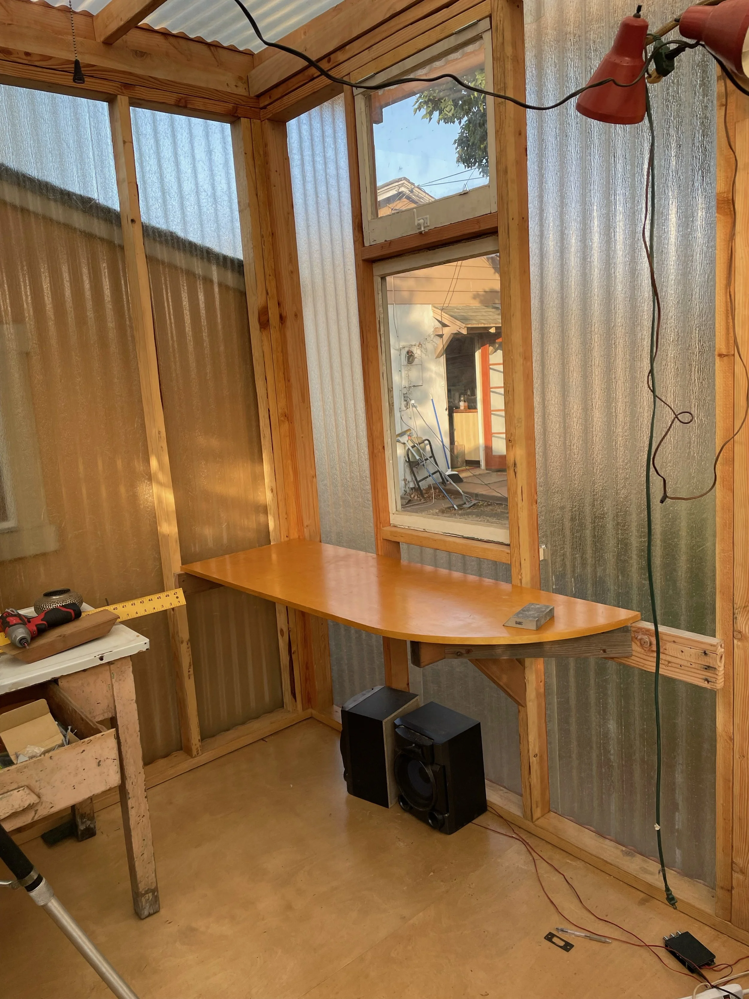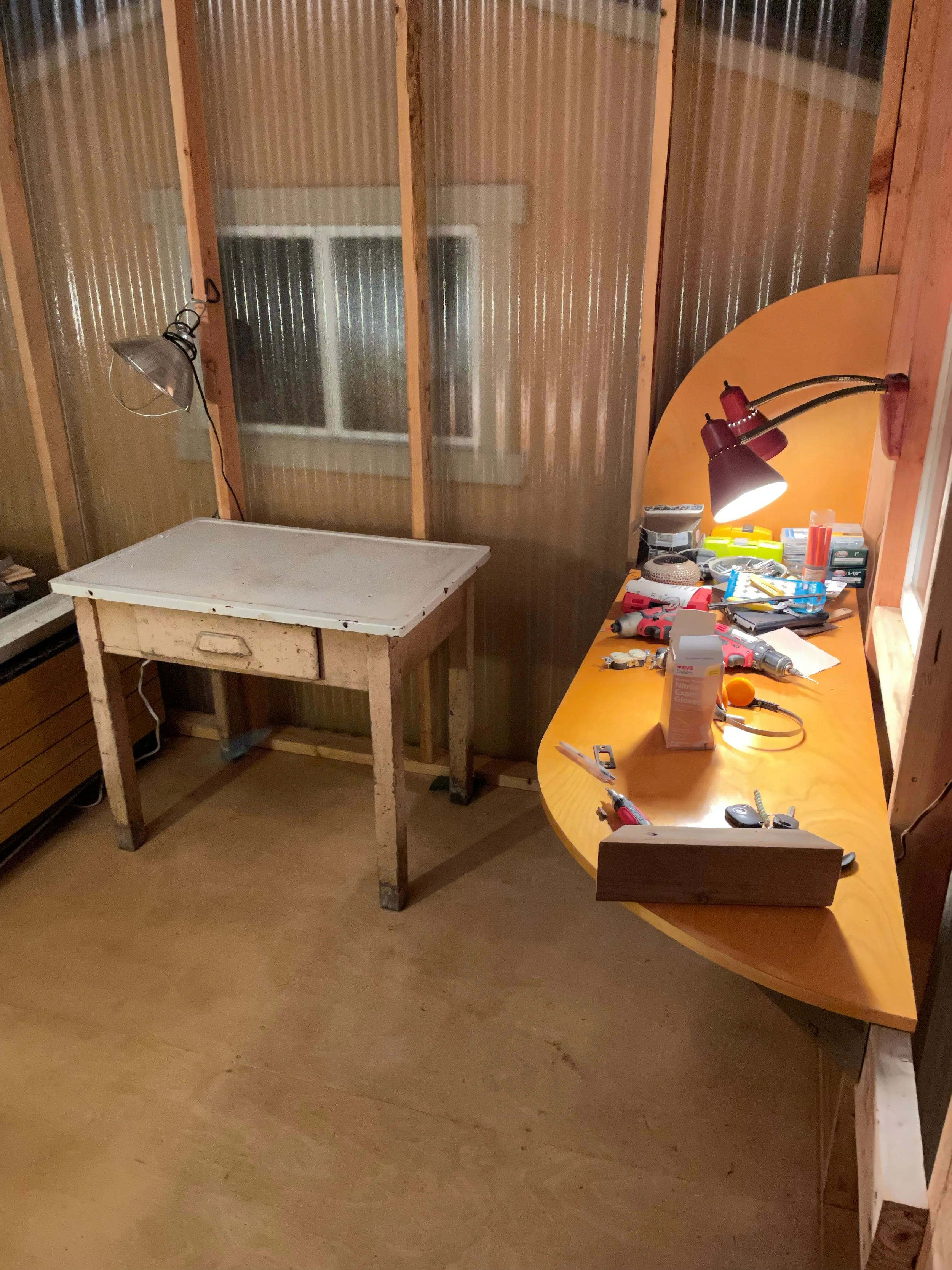 The oval then came to use today when I was thinking about desks. This morning when I woke up I didn’t think I would work much on the shed. I needed to put in some hours doing blknws transcripts. Had all these texts I was putting off (still am). I found that I couldnt really use the shed despite how much I had worked to this week. The only open surface was the dinky enamel top desk that was uncomfortable to sit at and it was covered in tools and screws.